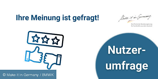 Internationale Fachkräfte, Auszubildende, Studierende, Forschende & Gründende aufgepasst! Haben Sie die "Make it in Germany"-Website bereits genutzt, um sich über das Arbeiten und Leben in Deutschland zu informieren? Dann freuen wir uns über Ihre Meinung, um die Seite zu evaluieren und weiterzuentwickeln! Unsere Umfrage dauert ca. 5 Minuten und ist anonym. Vielen Dank an alle Teilnehmenden!