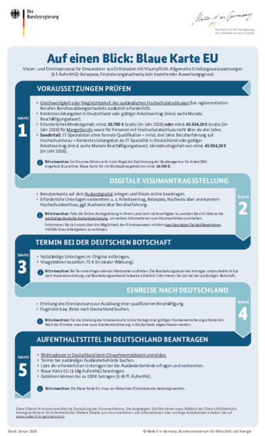 Erfüllen Sie die genannten Voraussetzungen? Dann haben Sie Anspruch auf Erteilung einer Blauen Karte EU nach § 18g AufenthG (Externer Link) . Informieren Sie sich über den Ablauf des Visum- und Einreiseprozesses.
